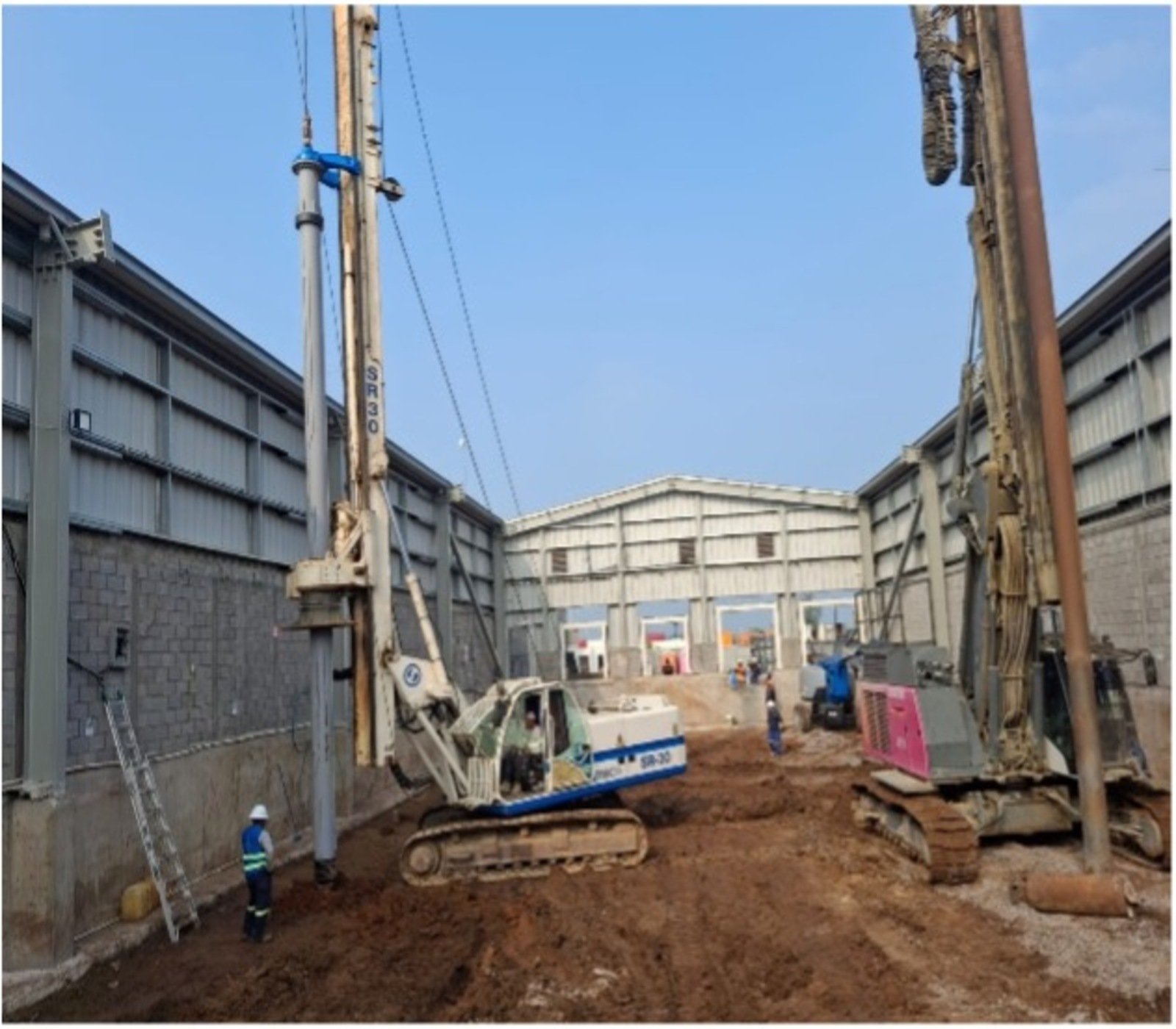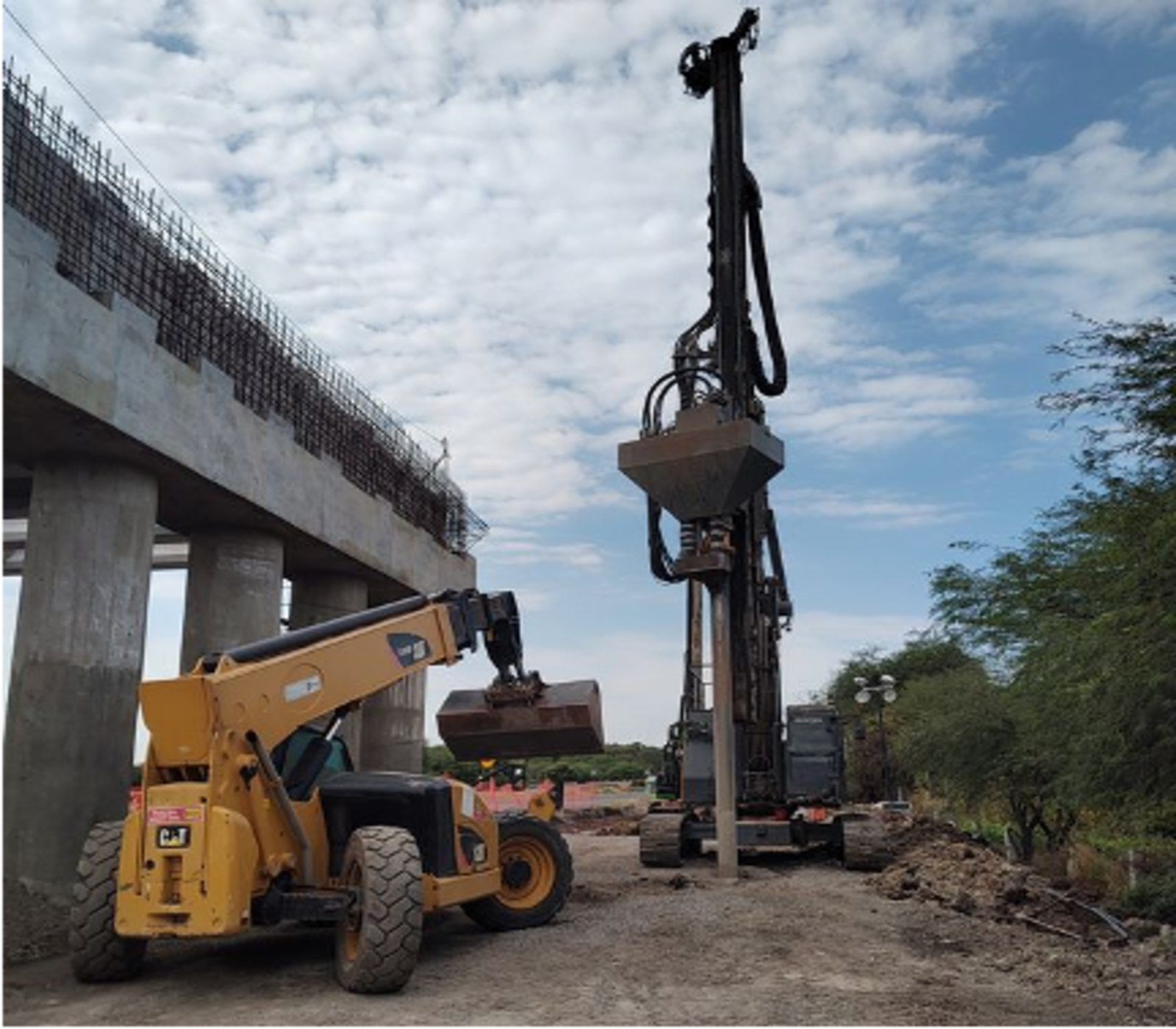 During the construction process, the mandrel is driven into the ground using specialized machinery and a vibratory hammer. Once the desired depth is reached, the gravel and mandrel are deposited through the hopper with the help of a telehandler.