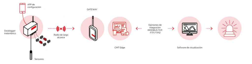 The datalogger sends the collected data to the Gateway using LoRa communication technology, a low-power wide area network. This allows data from the dataloggers to be transmitted to the Gateways over distances of up to 15 kilometers with very low power consumption.