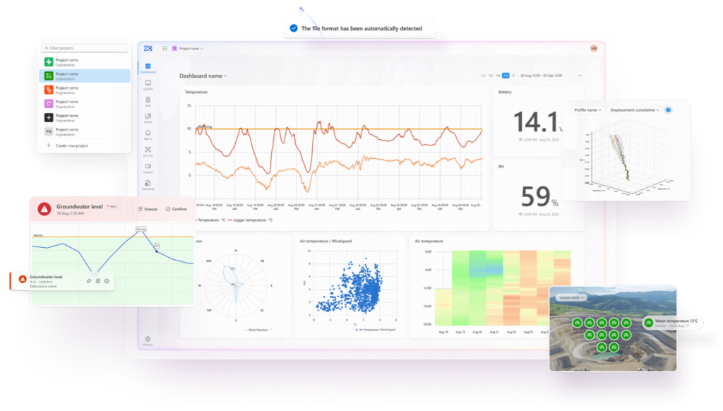 Oxstone is a next-generation monitoring platform designed for infrastructure, construction, and environmental projects, bringing all project data into one intuitive interface for real-time visualization and decision-making. It allows teams to create powerful custom dashboards that combine charts, tables, scatter plots, heat maps, layouts, and more in a single view, while also enabling widgets to be overlaid on project images to monitor sensor status and alarms in real time.